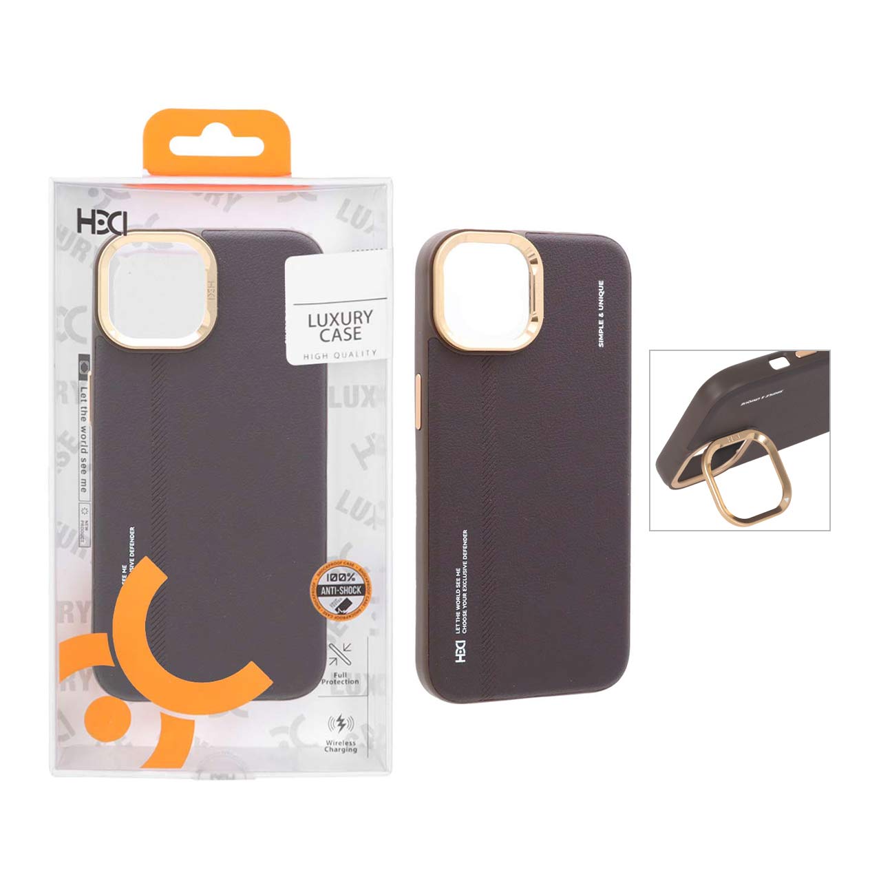 قاب اورجینال HDD طرح کربن محافظ لنز فلزی استندشو Apple iPhone 13 / iPhone 14 – قهوه ای تیره (پک دار)