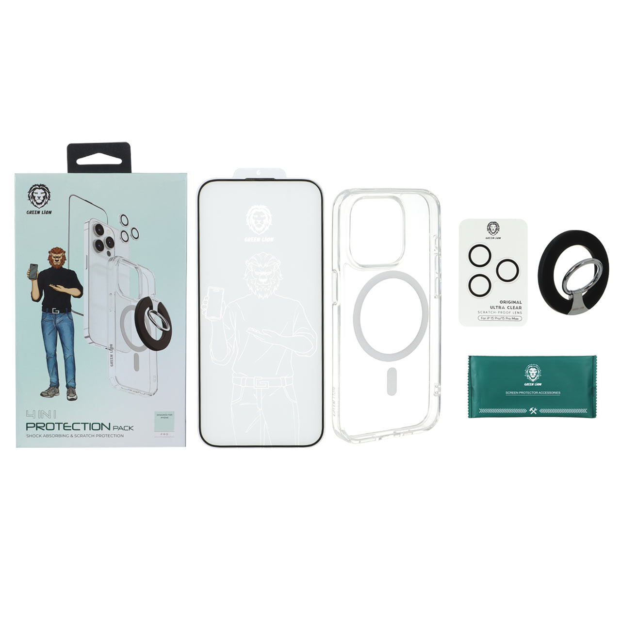 قاب اورجینال Green Lion 4IN1 با ست هولدر مگنتی استندشو محافظ لنز و صفحه نمایش Apple iPhone 15 Pro – شفاف (پک دار)